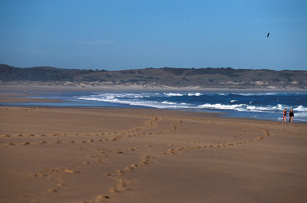 El complejo dunar, que incluye lago interior y marisma, es una de las playas gallegas más grandes. Además de ser un importante observatorio para la migración de aves marinas y acuáticas, es uno de los puntos de nidificación del chorlitejo patinegro. El arenal, que posee una rica flora con especies endémicas, marca un tránsito en el paisaje de la Costa da Morte a las Rías Baixas. En el pueblo del mismo nombre se encuentra el famoso hórreo en cantería (casi 35 m) de la casa rectoral: no en vano, carn es piedra en celta. Al norte se distingue el olímpico monte Pindo, lleno de leyendas y único lugar de toda Galicia donde crece el roble enano. Antes de la proliferación de embalses, la cercana cascada de Ezaro se desplomaba directamente sobre el mar desde 100 m. También están próximos los islotes de Lobeira y Carromoeiro en la entrada de la ría de Corcubión. (c) 2009 Herminia Bevia Villalba |