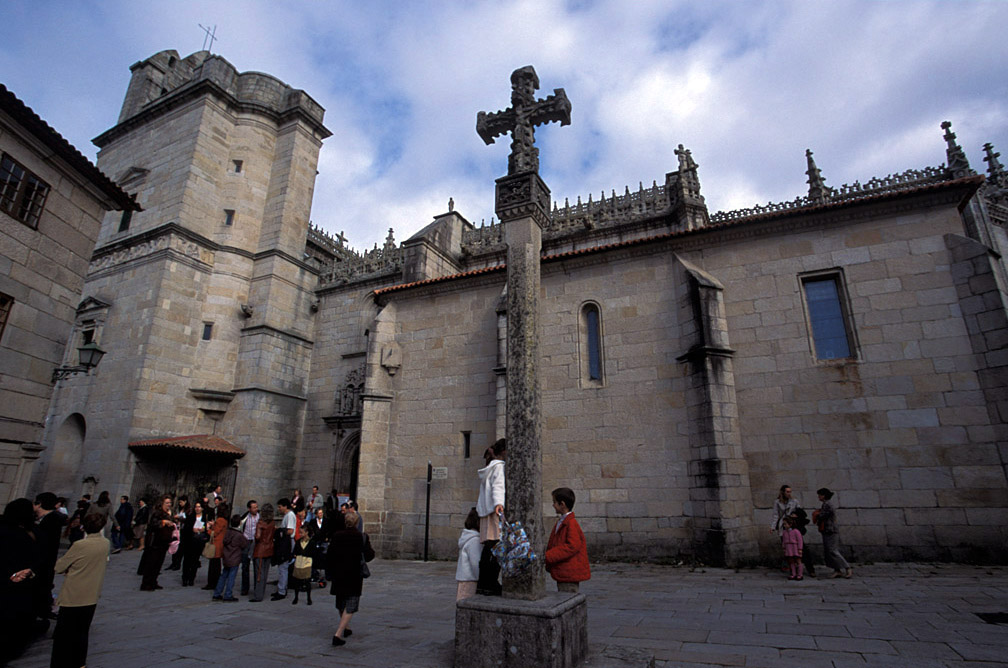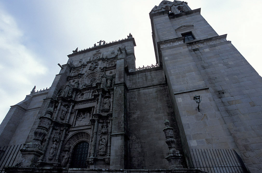 En lo que era el núcleo primitivo, sobre una iglesia románica, se construyó en el siglo XVI el templo actual a iniciativa del gremio de mareantes, que celebraba allí sus reuniones. Es el edificio más representativo de la ciudad, cuyos orígenes e historia cuenta su contraportada. Aunque combina el gótico, ojival, renacentista y barroco, el resultado es armónico. Sobresale la puerta oeste, en estilo plateresco y manuelino, sobre una gran escalinata, a modo de retablo en piedra con tres cuerpos y rematada por crestería en piedra. Tiene planta basilical con bóvedas estrelladas y tres naves, siendo la parte más antigua el ábside poligonal del lateral derecho. En el altar mayor se aprovecharon figuras y bajorrelieves del retablo original. También es de esa época la imagen de una virgen policromada en piedra situada frente al púlpito. Otro punto interesante es la fachada sur, que da a la plaza Arzobispo Fonseca, donde se eleva un crucero. (c) 2009 Herminia Bevia Villalba |